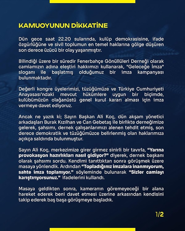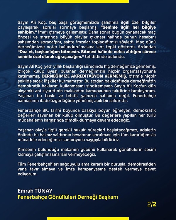Ancak ne yazık ki; Sayın Başkan Ali Koç, dün akşam yönetici arkadaşları Burak Kızılhan ve Can Gebetaş ile birlikte derneğimize gelerek, şahsımı, dernek çalışanlarımızı alenen tehdit etmiş, son derece demokratik ve tüzüğümüzce belirlenmiş olan haklarımıza açıkça taarruzda bulunmuştur.