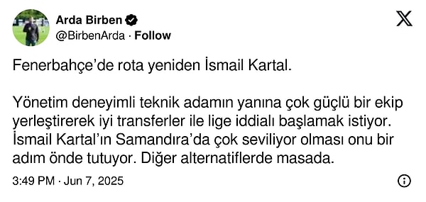 Yeni dönemde yıllardır beklediği şampiyonluğa ulaşmak isteyen Fenerbahçe’de teknik yönetici Mourinho’ya veda edilmesi beklenirken sarı-lacivertli idarenin kadrosu emanet etmek istediği isim ortaya çıktı. Arda Birben‘in aktardığına nazaran, rota yine İsmail Kartal’a dönmüş durumda.
