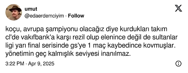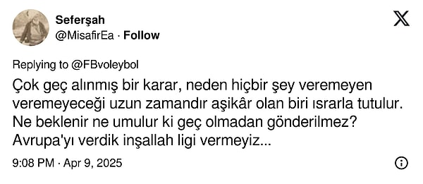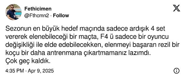 Sultanlar Ligi’nde olağan dönemi başkan tamamlayan Fenerbahçe Bayan Voleybol Ekibi, play-off etabında karşı karşıya geldiği ezeli rakibi Galatasaray’a 3-2’lik skorla kaybetti. Sarı-kırmızılılar, iki galibiyete ulaşan tarafın bir üst çeşide yükseleceği seride 1-0 öne geçerken Fenerbahçe’den ayrılık kararı geldi. Sarı-lacivertliler, başantrenörünü misyondan aldı.