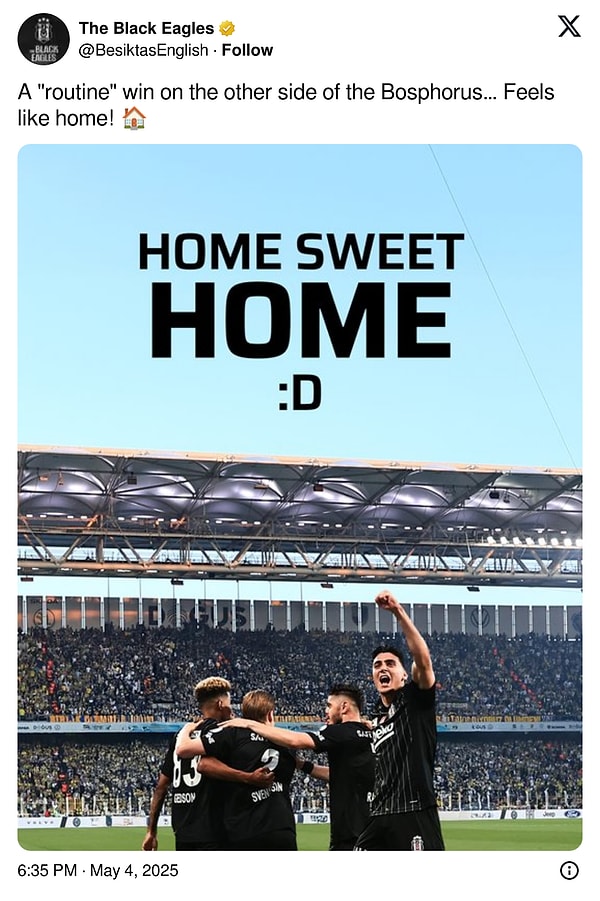 İngilizce yayın yapan resmi hesap da “Evim konutum hoş evim” paylaşımıyla Kadıköy deplasmanındaki geleneklerine gönderme yaptı.