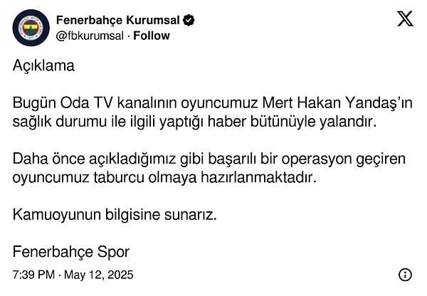 ‘Bugün Oda TV kanalının oyuncumuz Mert Hakan Yandaş’ın sıhhat durumu ile ilgili yaptığı haber bütünüyle palavradır.