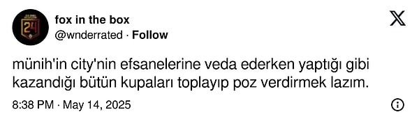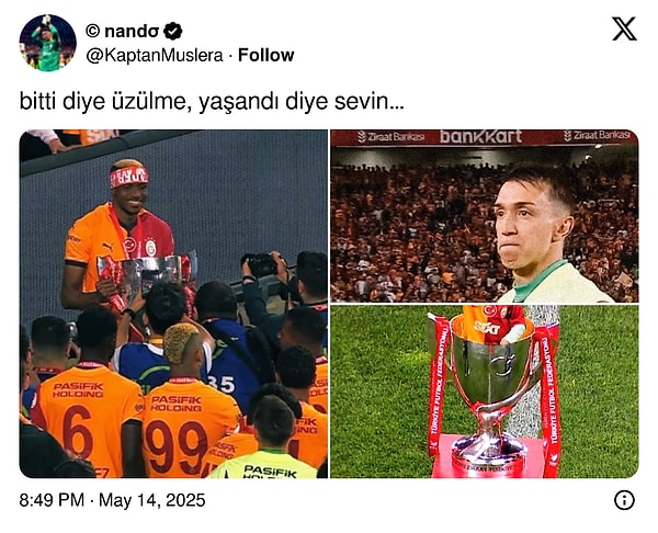 Lucas Torrerira, zafer sonunda toplumsal medya hesabından yaptığı paylaşımda Muslera için ‘Seninle her an özel kardeşim. Her şey için teşekkürler. Ve sonuncusu için gidiyoruz!’ ifadelerini kullandı. Torreira’nın paylaşımı veda olarak yorumlanırken Icardi de Muslera’nın gönderisine ‘bir yıl daha’ halinde yorum attı.