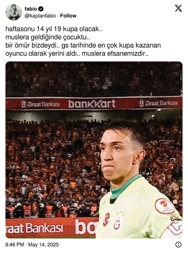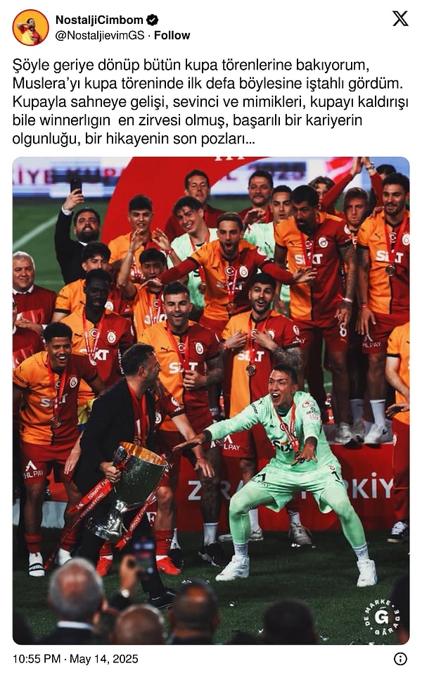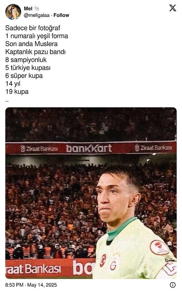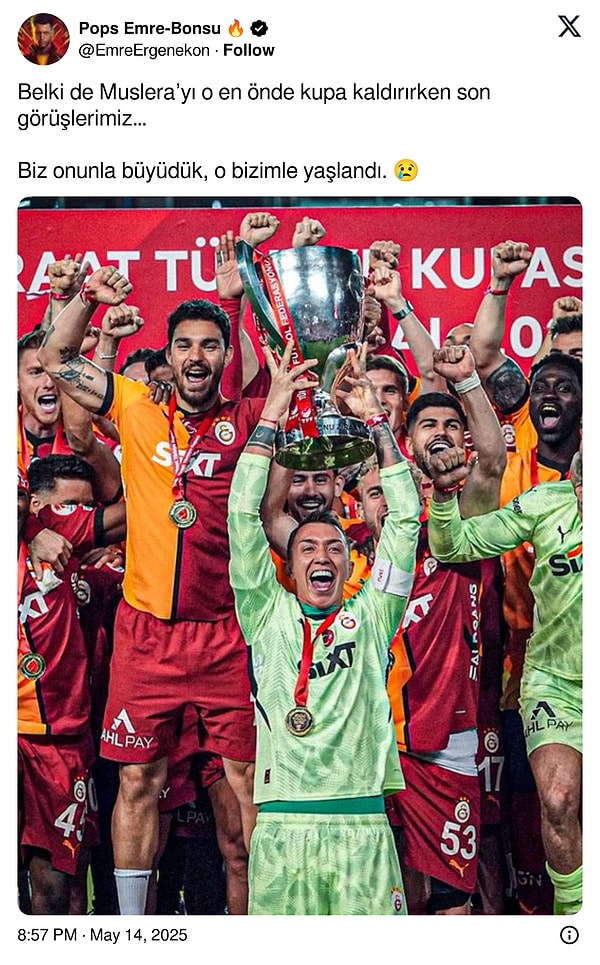 Galatasaray taraftarı, toplumsal medyada yıllardır kalelerini koruyan Uruguaylı oyuncuları Fernando Muslera’ya veda etmeye başladı. Sarı-kırmızılılar, 38 yaşındaki file bekçisinin yeni dönemde olmayacağına dair paylaşımlarda bulundu. Arka arda teşekkürler geldi.