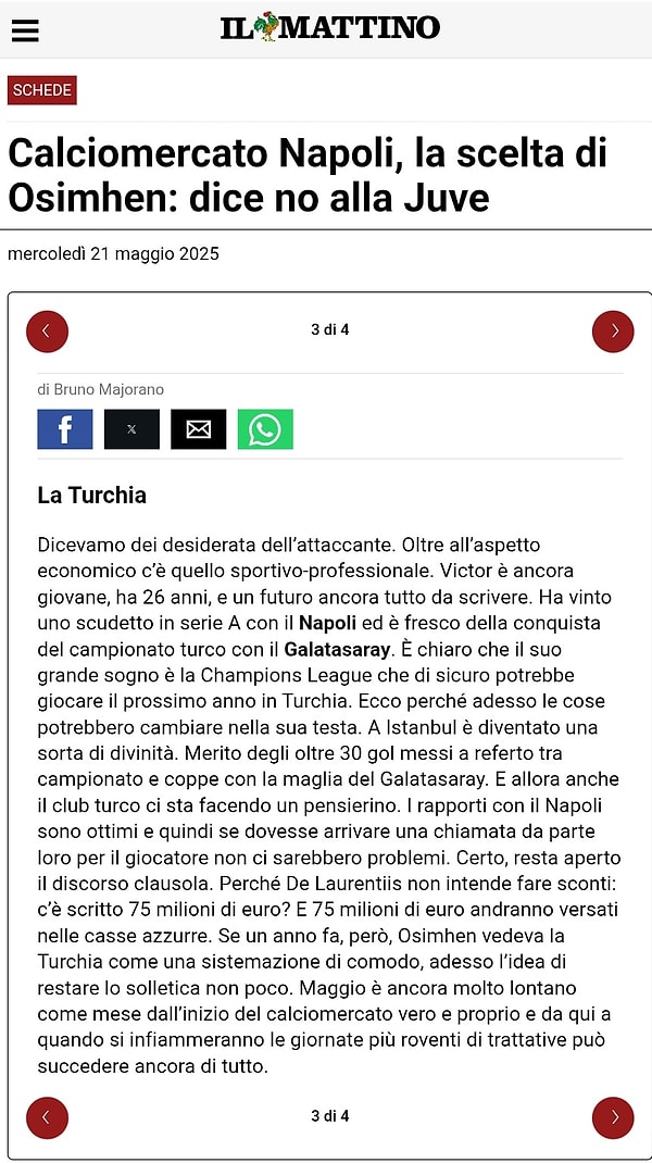 İtalya basınından Vilayet Mattino, 26 yaşındaki yıldızın Juventus’un teklifini geri çevirdiğini yazdı.