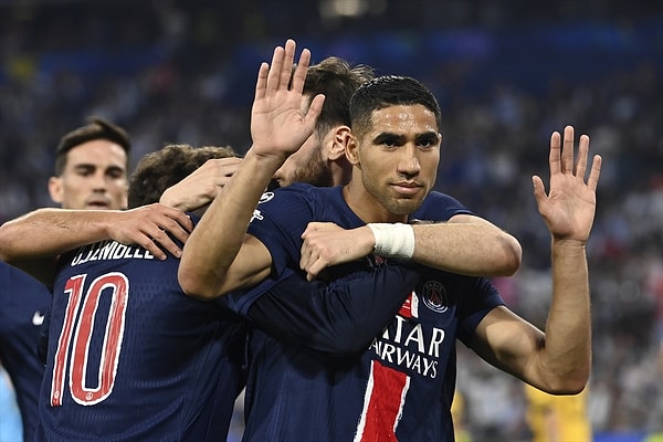 Hakimi ve Doue’nin golleriyle PSG devreyi 2-0 önde kapattı. Hakimi, eski grubu Inter’e attığı golün akabinde sevinmedi ve tribünlere ‘özür’ işareti yaptı ekip arkadaşları sevinirken .