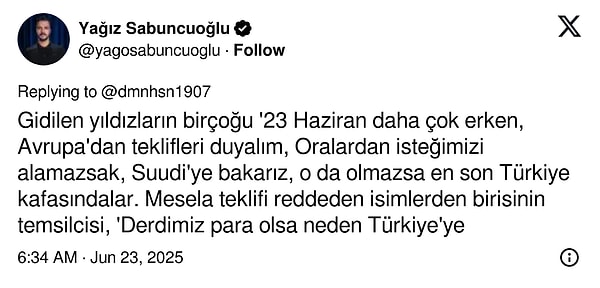 ‘Gidilen yıldızların birçoğu ’23 Haziran daha çok erken, Avrupa’dan teklifleri duyalım, Oralardan isteğimizi alamazsak, Suudi’ye bakarız, o da olmazsa en son Türkiye kafasındalar. Mesela teklifi reddeden isimlerden birisinin temsilcisi, ‘Derdimiz para olsa neden Türkiye’ye gelelim, Suudi’ye gideriz’ dedi. Marka pahası çok güzel yerlerde..’