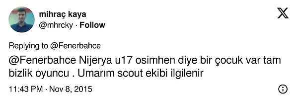 Mihraç Kaya isimli vatandaş ise Osimhen’i çok beğenmiş olacak ki Fenerbahçe’ye önermiş.