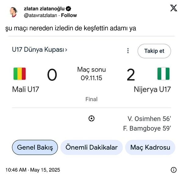 İzlediği maç ise Nijerya 17 yaş altı ekibinin Mali’yle oynadığı u17 Dünya Kupası.