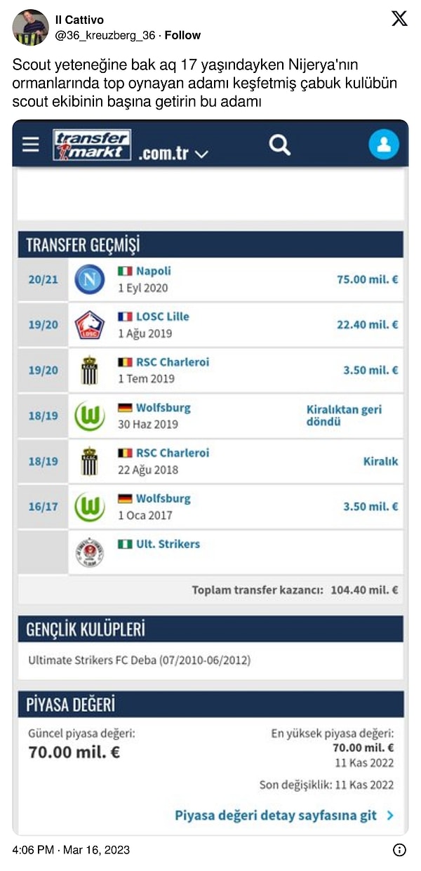 2019 yılında Belçika takımı Charleroi’yle Avrupa sahnesine adam atan Nijeryalı oradan Lille akabinde şampiyonluklarında büyük katkı verdiği Napoli’ye transfer oldu. Fakat onu 17 yaşındayken keşfedenler ortasında bir X hesabı vardı.