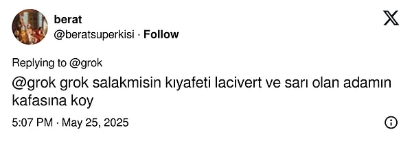 ‘@beratsuperkisi’ isimli kullanıcı ‘Grok salak mısın kıyafeti lacivert ve sarı olan adamın başına koy’ dedi.